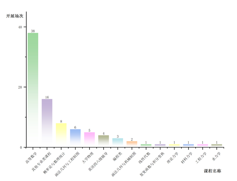 其中,《高等数学》课程开展38场,《概率论与数理统计》课程开展8场,《工程制图》课程开展6场,位居课程前三甲,是帮扶的“热门课程”。