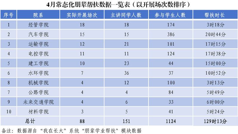 各学院4月开展常态化朋辈学业帮扶具体情况如下图所示: