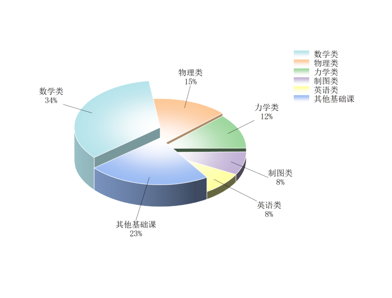在各类课程中,数学类课程开展34场,占比34%;物理类课程开展15场,占比15%;力学类课程开展12场,占比12%;制图类课程开展8场,占比8%;英语类课程开展8场,占比8%;其他基础课开展23场,占比23%。