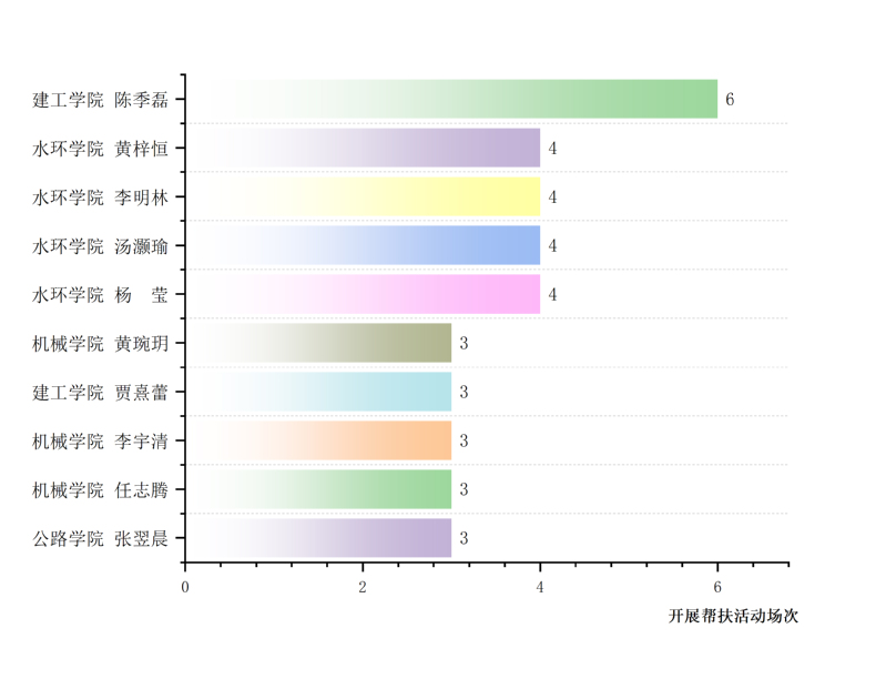 每一串数字背后都是优秀朋辈的匠心耕耘、助人为乐与热心奉献。其中,建工学院陈季磊同学作为主讲人开展朋辈学业帮扶6场,再次喜提“主讲之冠”。水环学院黄梓恒、李明林、汤灏瑜、杨莹,4名同学再次位居前列,以微光相伴,照亮前行的路。