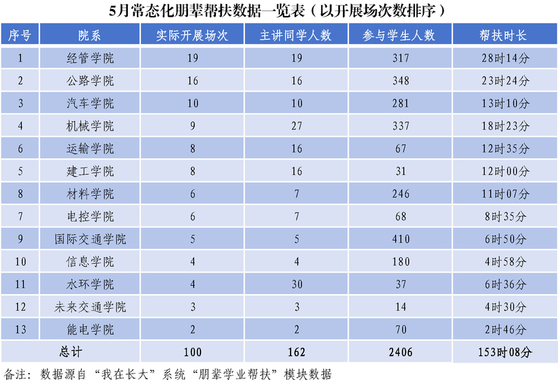 各学院5月开展常态化朋辈学业帮扶具体情况如下图所示: