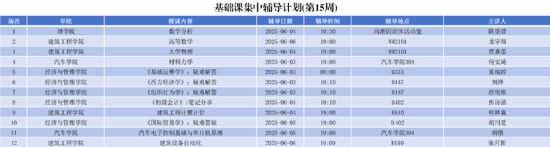 结合近期教育教学工作实际,现将第15周数学类、物理类、力学类等其他基础课程集中辅导安排(拟开展帮扶12科、12场次)面向全体学生公布。