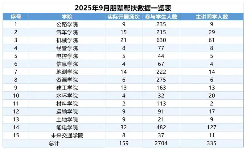为进一步加强我校学风建设和学业帮扶,充分发挥朋辈互助引领作用,切实帮助学生提升公共基础课程学习质量和效果,根据《长安大学加强学生学风建设实施方案》有关部署和《关于开展学生朋辈学业帮扶工作的通知》有关安排,结合2024-2025学年第二学期本科课程补考、缓考工作安排实际,各学院9月开展朋辈辅导159场次、参与学生2704人次。