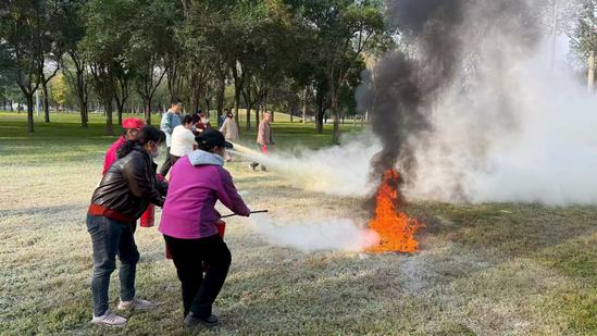 在灭火器实操环节,邀请消防专业人员进行现场示范,展示正确操作方法,并逐一指导参训人员进行干粉灭火器实操训练。