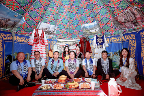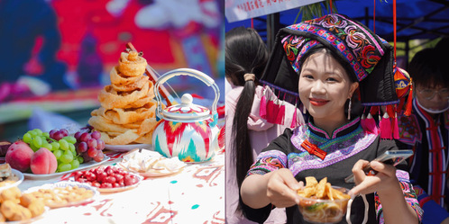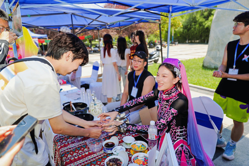 在广场两侧的各民族帐篷点内,各个民族的特色服饰、美食、器乐以及工艺品令现场师生纷纷驻足。