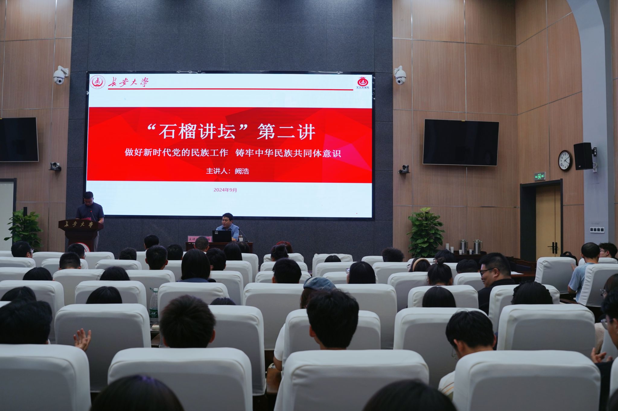 9月25日下午,学工部联合关工委在北校区师生服务大厅第二报告厅举办“石榴讲坛”第二讲,邀请陕西省民族宗教事务委员会民族一处副处长阙浩作题为《做好新时代党的民族工作,铸牢中华民族共同体意识》的专题报告。报告由学工部副部长刘鹏主持。