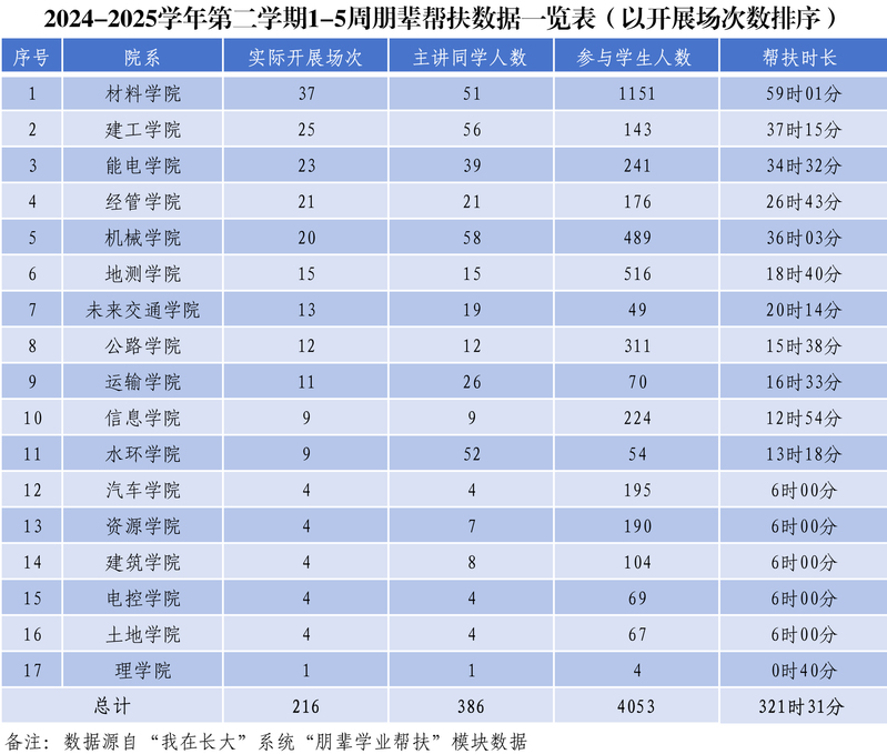 为进一步加强我校学风建设和学业帮扶,充分发挥朋辈互助引领作用,针对2024-2025学年第一学期本科课程补考、缓考实际,各学院(系)积极开展朋辈学业帮扶,第1-5周开展朋辈学业帮扶辅导216场,参与学生4053人次,时长超过320小时。