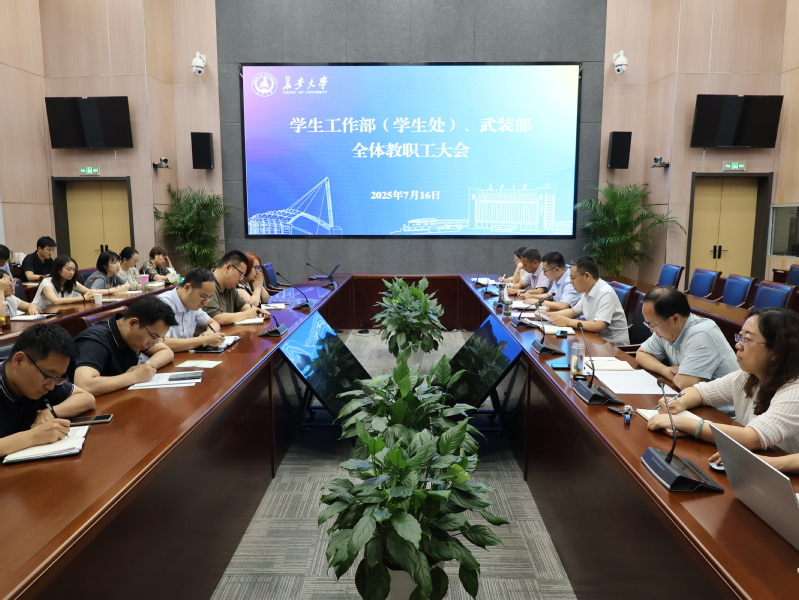 7月16日下午,学工部(学生处)、武装部在北校区师生服务大厅第一报告厅召开全体教职工大会,学工部(学生处)、武装部部长姬国斌总结2025年上半年工作并安排部署暑期工作,会议由学工部副部长李阳主持。