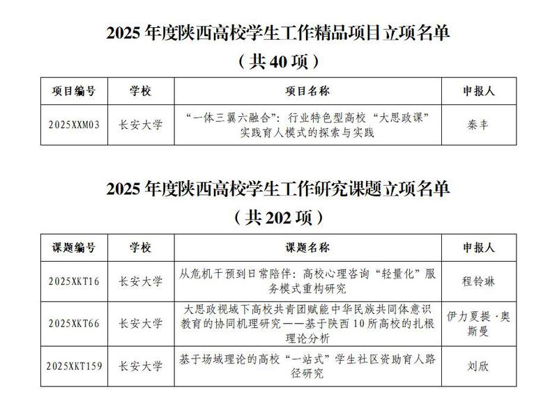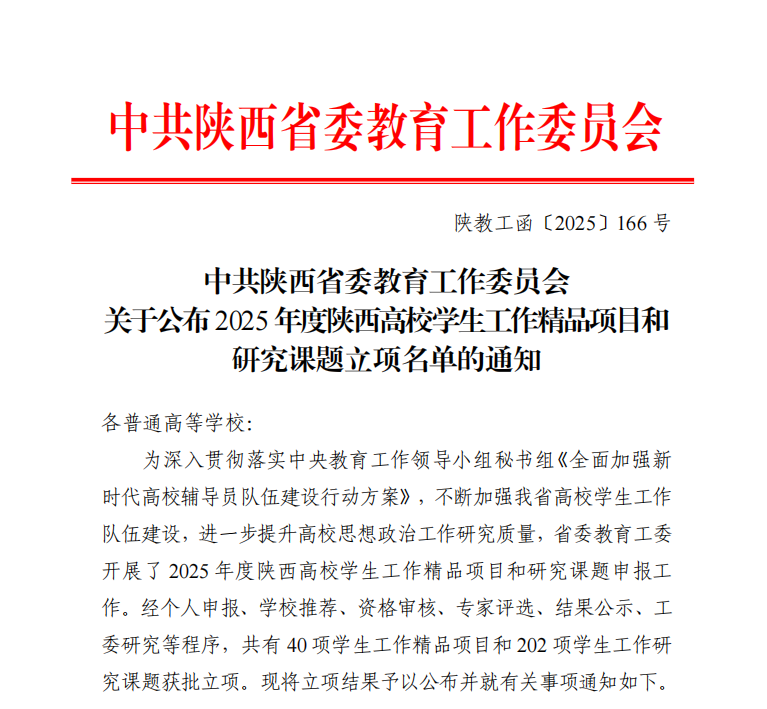 近日,中共陕西省委教育工委公布了2025年度陕西高校学生工作精品项目和研究课题立项名单。经个人申报、学校推荐、资格审核、专家评选、结果公示、工委研究等程序,我校申报的1项学生工作精品项目、3项学生工作研究课题全部获批立项。