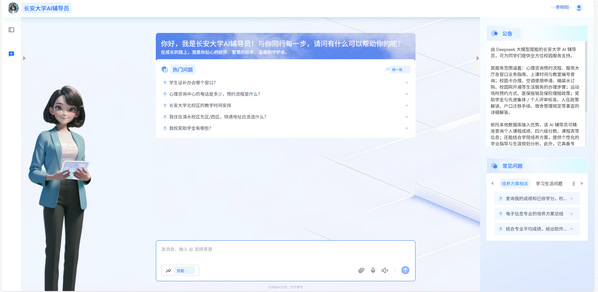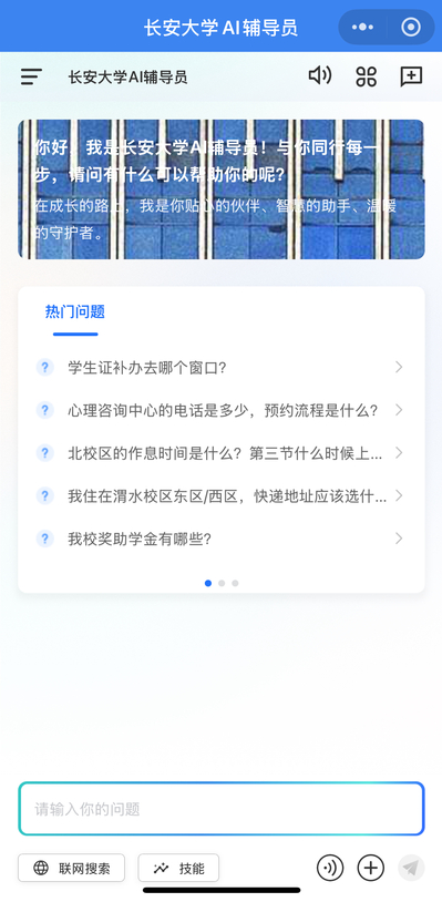 “长安大学AI辅导员”的上线,标志着学校智慧校园建设迈出新步伐。现诚邀全体师生体验使用,共同探索校园服务新模式,携手开启智慧“长大”!