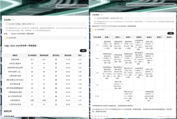 “AI辅导员”依托学校大数据中台,进行数据治理,实时整合学生个人信息、成绩数据、课程安排等信息,打通校园个性化服务的“最后一公里”,为每位学生提供成绩查询、第二课堂、四六级成绩等数据需求,以可视化呈现,清晰直观。
