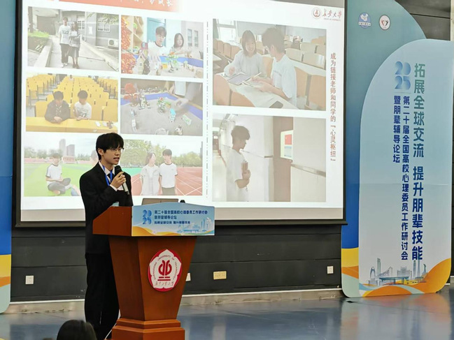 本次论坛以“拓展全球交流,提升朋辈技能”为主题,旨在加强高校心理委员队伍建设,促进心理健康教育理论与实践交流。会议期间,我校师生代表认真听取“朋辈心理帮扶技术”“危机干预程序”等主题报告,并与各高校代表深入交流。在分论坛环节,梁俊辉作题为《“铸魂·润心·筑桥”——思政与心理双轮驱动的育人实践探索》的主题报告。他从“价值引领筑牢思想根基、品牌活动涵育健康心态、机制建设贯通育人脉络”三个维度,系统介绍了我校心理委员在心理育人方面的创新实践。报告结合“情绪盲盒”“绿叶传情”“绿植领养”等品牌活动案例,生动阐释了如何通过搭建内容、机制与传播之桥,实现思政育人与心理育人的深度融合,展现了我校“思政与心理双轮驱动”育人模式的实效,赢得了与会代表的广泛共鸣。