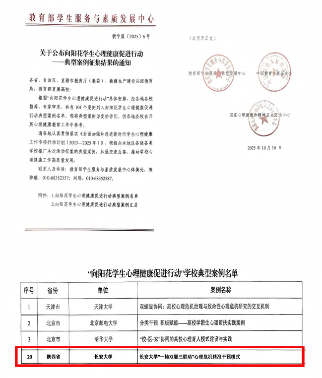 为深入贯彻《全面加强和改进新时代学生心理健康工作专项行动计划(2023—2025年)》,把心理健康作为学生全面发展的前提和基础,五育并举促进学生健康成长,教育部组织实施了“学生心理健康促进行动”,并于2025年6月面向全国征集学生心理健康教育工作典型案例,旨在总结推广各地各校的有效经验和成熟模式,发挥优秀实践的示范引领作用。近日,教育部公布遴选结果,我校申报的《长安大学“一轴双驱三联动”心理危机精准干预模式》成功入选典型案例。